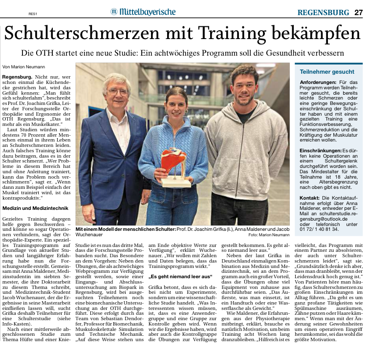 Unter der Leitung von Prof. Dr. Joachim Grifka und einem interdisziplinären Team aus Orthopädie, Biomechanik sowie Medizin- und Gesundheitstechnik wird ein achtwöchiges Trainingsprogramm entwickelt und wissenschaftlich begleitet. Die Teilnehmenden sollen durch regelmäßige, angeleitete Übungen ihre Schulterfunktion verbessern und Beschwerden verringern.